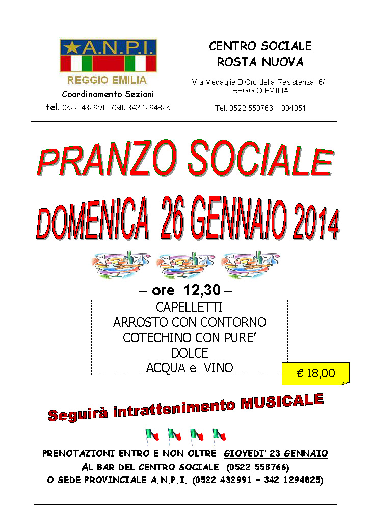 Le prenotazioni dovranno avvenire entro giovedì 23 di gennaio al Bar del Centro Sociale (0522 558766) oppure presso la Sede Provinciale ANPI (0522 432991 – 342 1294825)