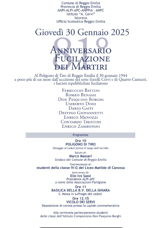 Al Poligono di Tiro di Reggio Emilia il 30 gennaio 1944 a poco più di un mese dall’uccisione dei sette fratelli Cervi e di Quarto Camurri, i fascisti repubblichini fucilarono: Ferruccio Battini, Romeo Benassi, Don Pasquino Borghi, Umberto Dodi, Dario Gaiti, Destino Giovannetti, Enrico Menozzi, Contardo Trentini, Enrico Zambonini.