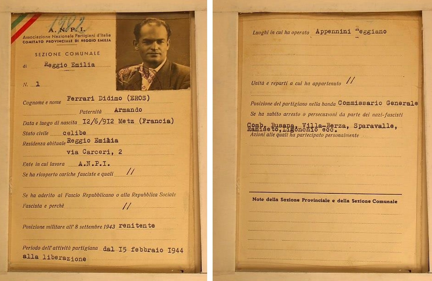 Il primo dirigente dell’ANPI provinciale, come Segretario (i suoi successori si chiamarono poi Presidenti) fu Didimo Ferrari, “Eros”, Commissario generale del Comando unico e vero e proprio capo carismatico. Eros aveva 35 anni ma già alle spalle un curriculum che rendeva leggendaria la sua figura.